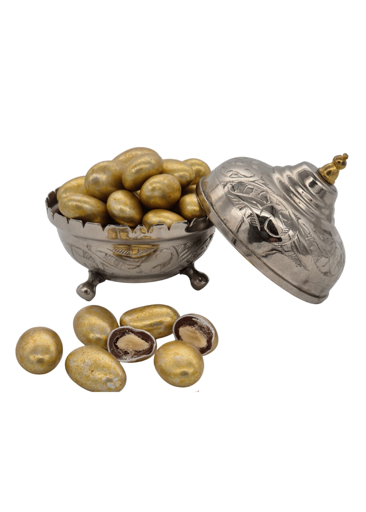 - Altın renkli çikolata kaplı bademlerle şık sunum